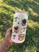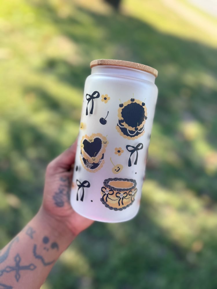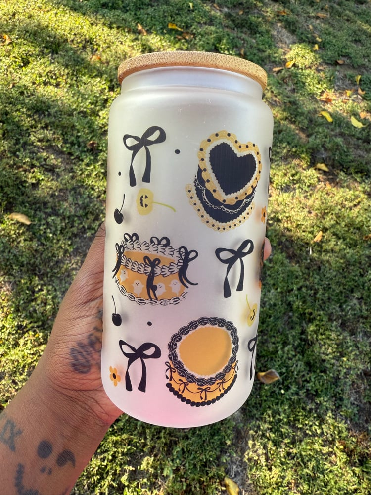 16oz sublimation frosted glass can with sublimation design. Straw & lid included. This is a made to order product. Current turnaround times are listed on home page.